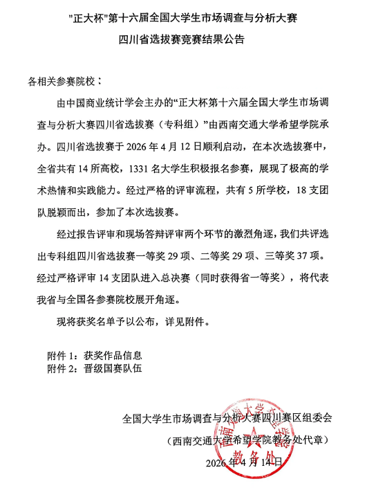 全国大学生市场调查与分析大赛是国内市场调查领域规模最大、影响力最广的国家级学科赛事,旨在以赛促学、以赛促教,培养大学生的创新精神、实践能力与科学素养。本次四川省选拔赛吸引了全省数十所高职院校的数百支队伍同台竞技,竞争激烈。我院参赛团队紧扣地方发展与民生热点,以科学的研究设计、严谨的数据分析和务实的成果输出,从众多项目中脱颖而出。