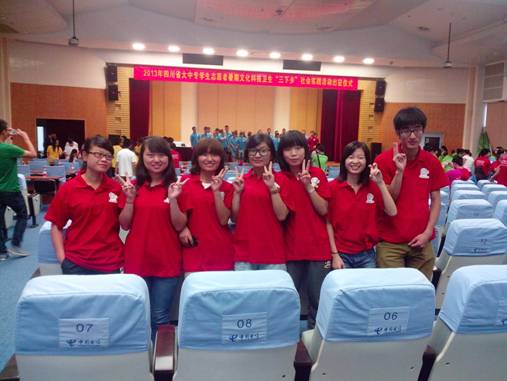7月12日清晨,天空中下着小雨,信息工程系“三下乡”暑期社会实践队就兵分两路,开始了三下乡第一天的活动,六个人向着幸福镇的友爱社区进发,另外的七个人代表信息工程系和学院其他的同学到成都参加“三下乡”社会实践活动出征仪式。