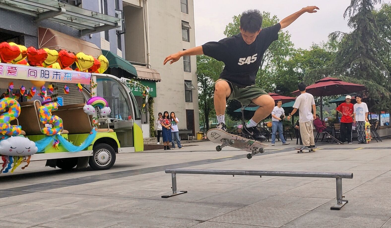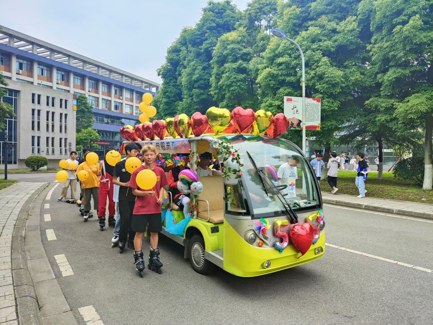 中午12:15,伴随着下课铃声,被横幅、风车、气球、拉花、流苏装饰一新的“花车”在轮滑协会同学和滑板小分队的护送下从2A教学楼一侧校园主干道缓慢出发,立刻吸引了下课同学们的目光。同学们纷纷上前拍照,伴随“花车”一路前行。